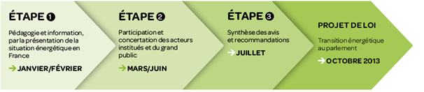 Le débat se déroule dans toute la France et durera jusqu’à la fin du mois juillet 2013. Les contributions au débat seront les bases d’un projet de loi de programmation à l’automne (octobre 2013).