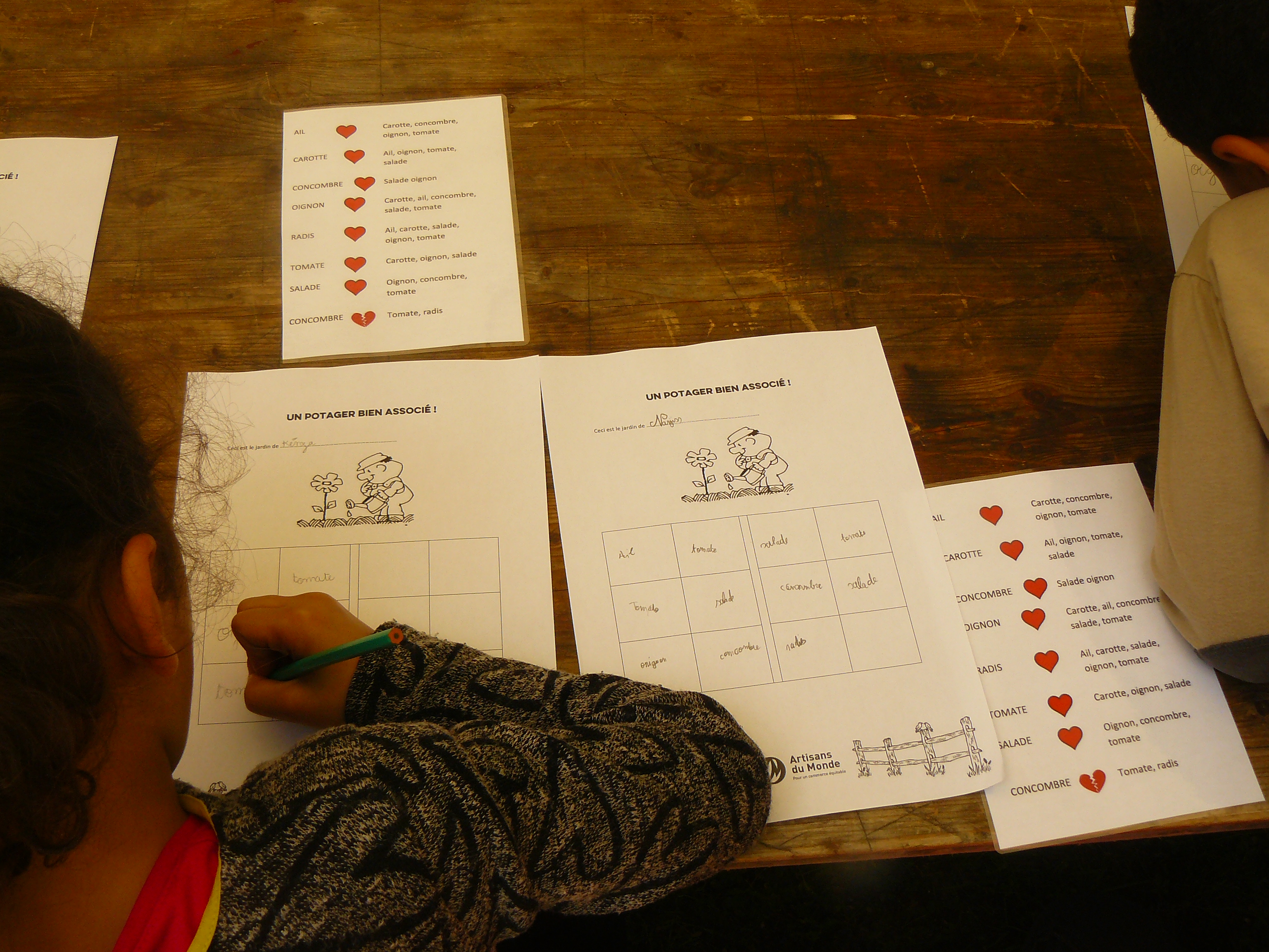 Histoire de les faire passer de l’explication à l’application, les enfants sont ensuite passés à l’action en imaginant un potager bien associé qu’il serait possible de cultiver dans la métropole lyonnaise. Pour cela, chaque enfant avait une feuille qui symbolisait leurs carrés de potager : ils devaient ensuite créer leur potager idéal en plaçant les légumes à partir d’une fiche d’information sur la bonne entente ou non de ces légumes. Tous les élèves se sont prêtés au jeu et sont repartis en ayant eu le sentiment d’avoir appris quelque chose ! Chacun y trouve son compte. Pour une des enseignantes : « C’est bien d’avoir défini ce qu’était le commerce équitable car la plupart des élèves ne savent pas ce que c’est. Et surtout de rappeler qu’il y a un lien avec l’environnement parce qu’on l’ignore souvent, moi la première ! ».