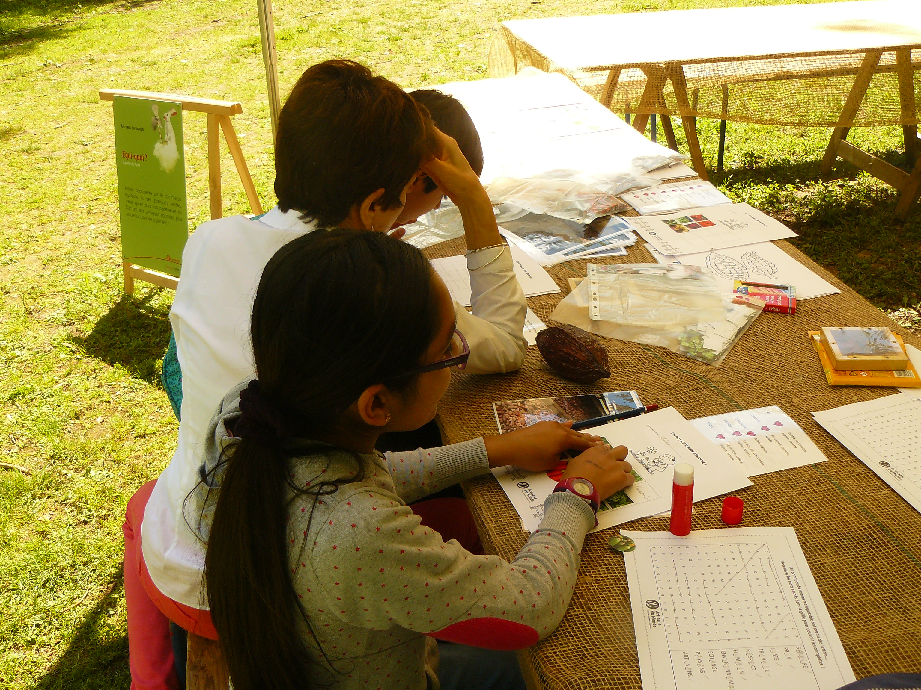 Le samedi 20 mai, les ateliers étaient ouverts au grand public et le beau temps a permis d’attirer beaucoup de familles. Pour cet après-midi-là, Artisans du Monde proposait 3 activités selon l’envie et l’âge des participants : mots-cachés des principes du commerce équitable ; jeu du potager bien associé ; découverte de la culture du cacao et coloriage d’une cabosse de cacao pour les plus petits. Les familles étaient contentes de pouvoir participer sur un même stand à différentes activités qui conviennent à différentes tranches d’âge.