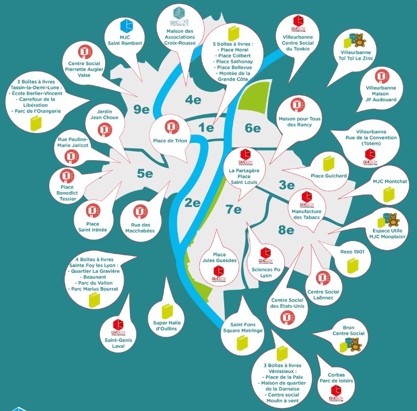 La toute première Givebox a été posée en novembre 2014 place Jules Guesde (7ème), suivie en 2015 par les Boîtes d’échange entre voisins du quartier de Saint-Just (5ème). Depuis, il en fleurit un peu partout : à Lyon où on en dénombre une trentaine, mais il y en a aussi à Villeurbanne, Saint-Fons, Oullins,Vénissieux…